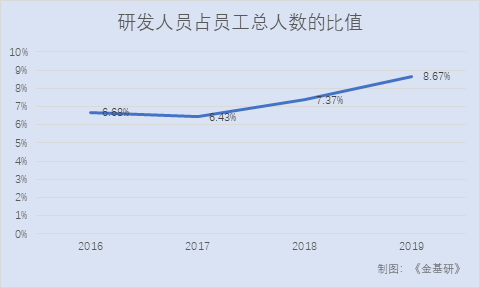 同期,指南针研发人员占员工总人数的比值分别为6.68%、6.43%、7.37%、8.67%。
