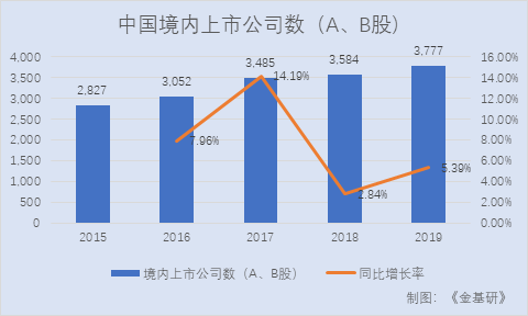 据国家统计局数据,2015-2019年,中国境内上市公司数(A、B股)分别为2,827家、3,052家、3,485家、3,584家、3,777家,2016-2019年分别同比增长7.96%、14.19%、2.84%、5.39%。
