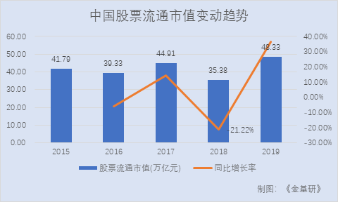据同花顺iFinD数据,2015-2019年,中国股票流通市值分别为41.79万亿元、39.33万亿元、44.91万亿元、35.38万亿元、48.33万亿元,2016-2019年分别同比增长-5.9%、14.2%、-21.22%、36.61%。