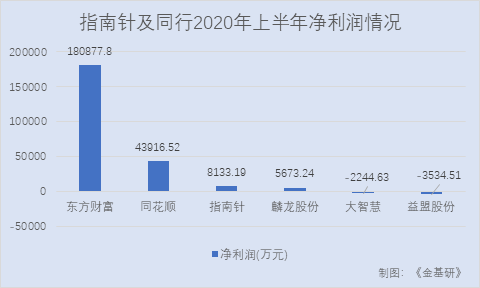2020年上半年,指南针的净利润为8,133.19万元,同比增长-16.46%。尽管净利润同比下滑,但其净利润表现却优于多家同行业可比公司。