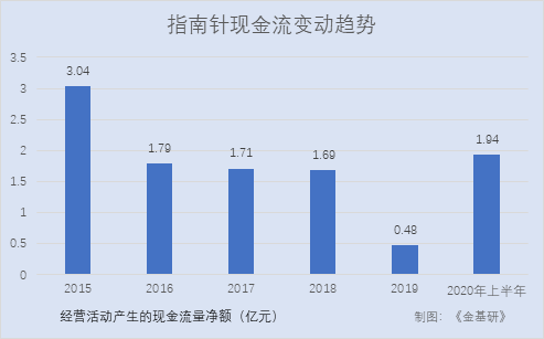 2015-2019年及2020年上半年,指南针经营活动产生的现金流量净额分别为3.04亿元、1.79亿元、1.71亿元、1.69亿元、0.48亿元、1.94亿元。
