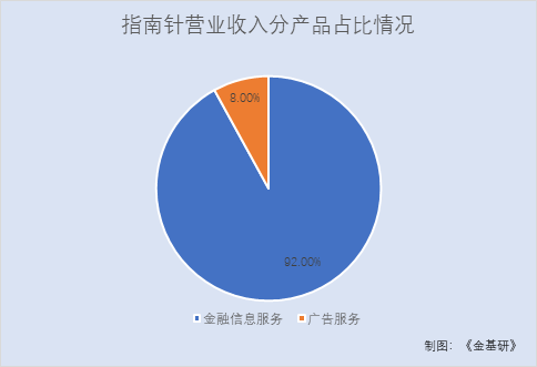 2020年上半年,指南针金融信息服务和广告服务占营业收入的比值分别为92%、8%。