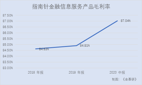 据同花顺iFinD数据,2018-2019年及2020年上半年,指南针金融信息服务的毛利率分别为84.63%、84.91%、87.04%。
