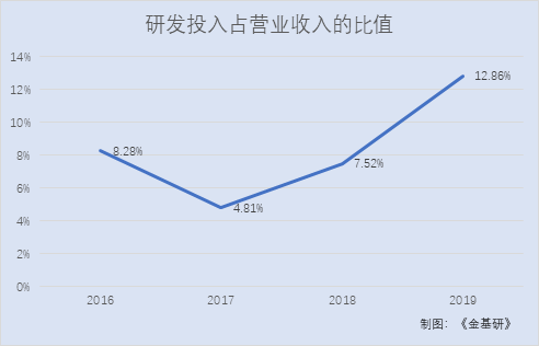 近年来,指南针的研发投入不断增加。2016-2019年,指南针研发投入占营业收入的比值分别为8.28%、4.81%、7.52%、12.86%。