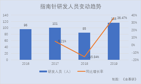 据同花顺iFinD数据,2016-2019年,指南针研发人员数量分别为96人、101人、85人、116人,2017-2019年分别同比增长5.21%、-15.84%、36.47%。