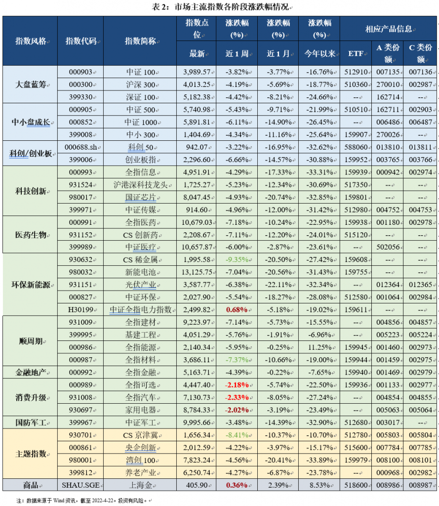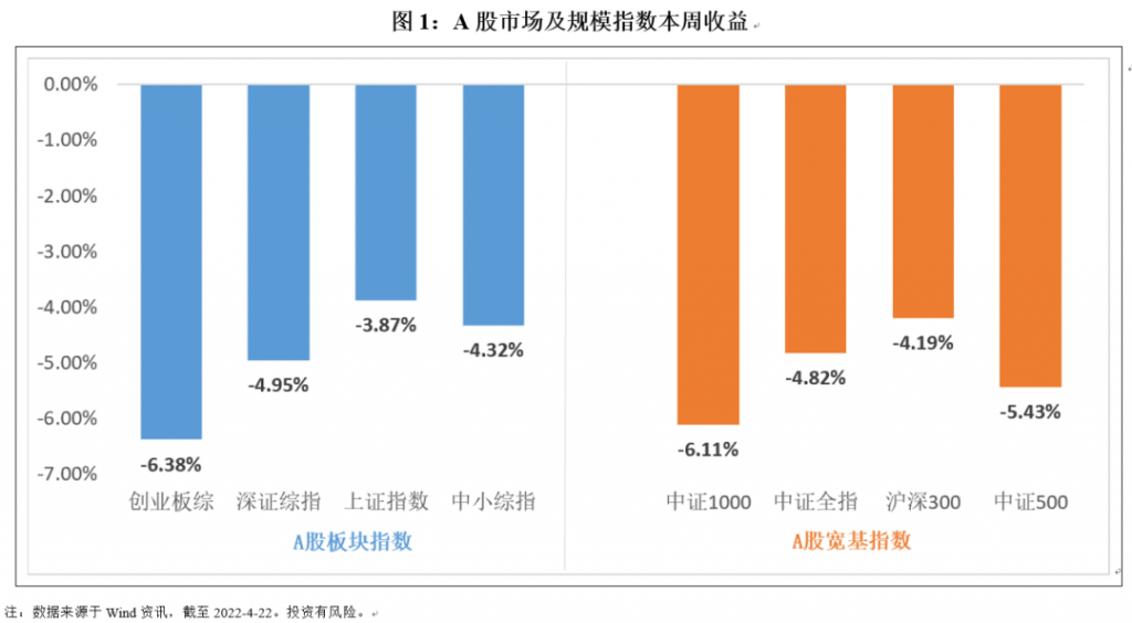 港股方面,本周港股跟随A股和美股下跌,成长风格跌幅大于价值,恒生科技大跌7.38%。海外方面,美联储不断发表鹰派言论,驱动美债名义利率上行至近 3%,实际 利率疫情后首度转正;以纳指为代表的全球成长股不断回调,而油价则停留在 100 美元上方居高不下,美股恐慌指数 VIX 则在周五大幅上行。国内方面,经 济预期依旧低迷,上海疫情新增确诊见拐点但并未有效提振市场情绪。在这样 的背景下,建议一方面配置高股息等防御风格,另一方逐步加仓估值已经处在 底部,而中长期价值并未被破坏的成长行业,如互联网、医药。