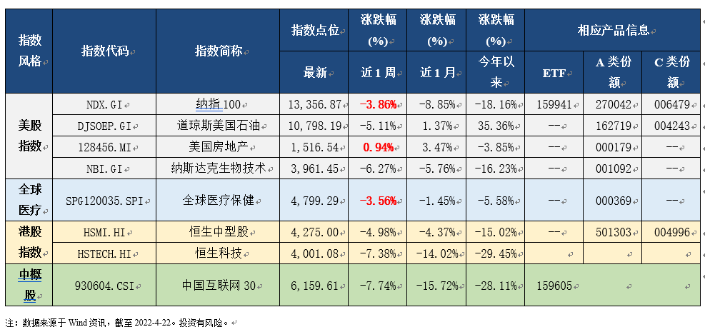 海外市场方面:截至4月22日,美国房地产指数表现最好,涨跌幅为0.94%;中国互联网30指数表现最差,涨跌幅为-7.74%。