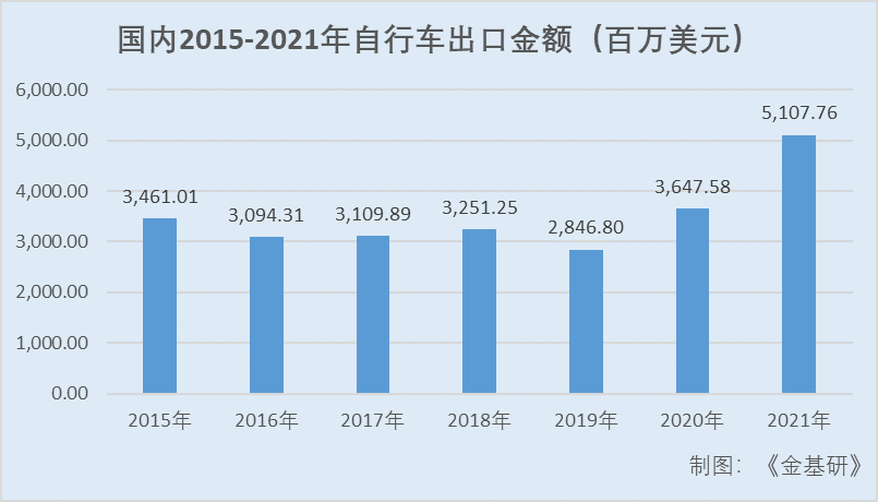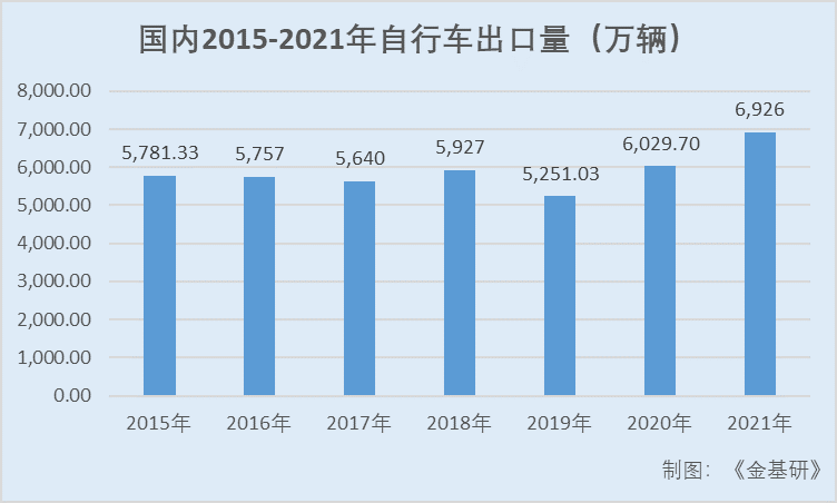 值得一提的是,据统计数据,2020年和2021年国内自行车出口数量和出口金额皆实现较快增长。其中2021年国内自行车出口数量为6,926万辆,同比增长14.9%;出口金额为51.08亿美元,同比增长40%。
