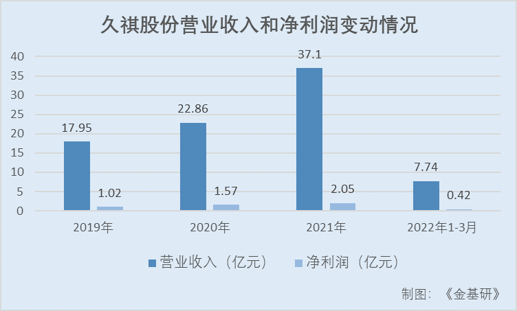 据久祺股份签署日为2021年8月4日的招股书(以下简称“招股书”)以及久祺股份2021年年报、2022年一季报,2019-2021年及2022年1-3月,久祺股份的营业收入分别为17.95亿元、22.86亿元、37.1亿元、7.74亿元,同期,净利润分别为1.02亿元、1.57亿元、2.05亿元、0.42亿元。