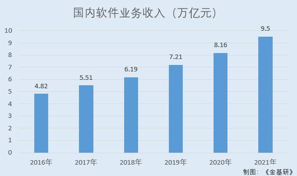 2016-2021年,国内软件业务收入分别为4.82万亿元、5.51万亿元、6.19万亿元、7.21万亿元、8.16万亿元、9.5万亿元。其中,2021年国内软件业务收入同比增长17.7%。