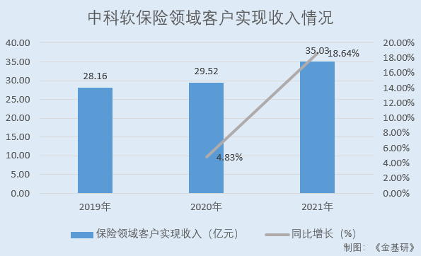 2019-2021年,中科软对保险领域客户实现收入分别为28.16亿元、29.52亿元、35.03亿元,2020-2021年分别同比增长4.83%、18.64%。