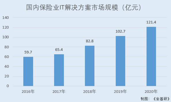 2016-2020年,国内保险业IT解决方案市场规模分别为59.7亿元、65.4亿元、82.8亿元、102.7亿元、121.4亿元。