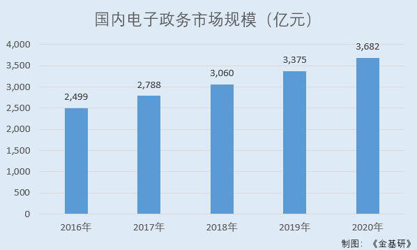 2016-2020年,国内电子政务市场规模分别为2,499亿元、2,788亿元、3,060亿元、3,375亿元、3,682亿元。