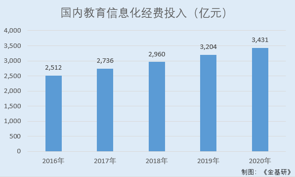 2016-2020年,国内教育信息化经费投入金额分别为2,512亿元、2,736亿元、2,960亿元、3,204亿元、3,431亿元。
