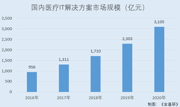 2016-2020年,国内医疗IT解决方案市场规模分别为956亿元、1,311亿元、1,710亿元、2,303亿元、3,105亿元。
