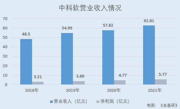 据东方财富Choice数据,2018-2021年,中科软营业收入分别为48.5亿元、54.99亿元、57.82亿元、62.81亿元,2019-2021年分别同比增长13.38%、5.14%、8.65%。