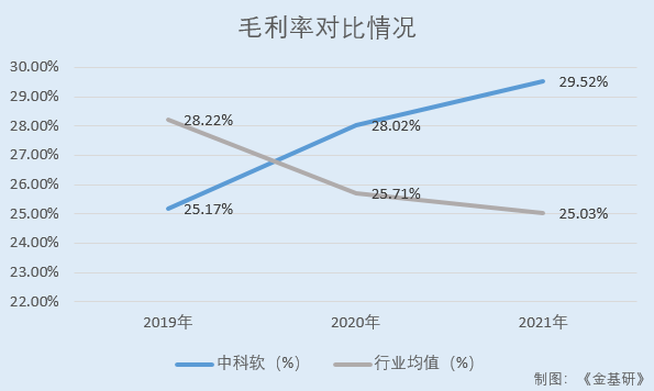 2019-2021年,中科软毛利率分别为25.17%、28.02%、29.52%。