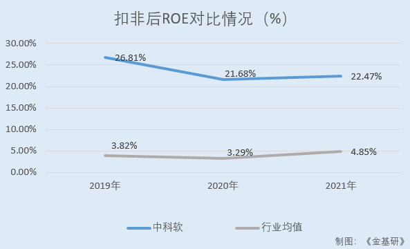 据东方财富Choice数据,2019-2021年,中科软扣非后加权平均净资产收益率分别为26.81%、21.68%、22.65%。
