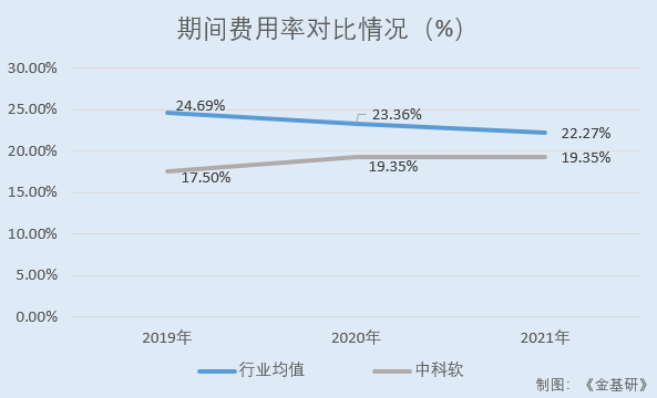 据东方财富Choice数据,2019-2021年,中科软的期间费用率分别为17.5%、19.35%、19.35%。需要说明的是,虽然报告期内中科软的期间费用率呈上涨趋势,但主要系研发费用率增加造成。
