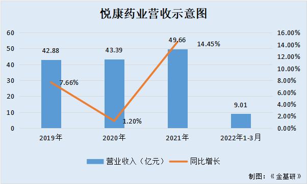 据东方财富Choice数据,2019-2021年及2022年1-3月,悦康药业的营业收入分别为42.88亿元、43.39亿元、49.66亿元、9.01亿元,2019-2021年分别同比增长7.66%、1.2%、14.45%。