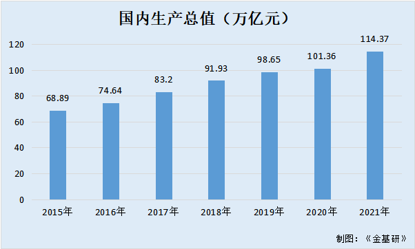 据国家统计局数据,2015-2021年,国内生产总值分别为68.89万亿元、74.64万亿元、83.2万亿元、91.93万亿元、98.65万亿元、101.36万亿元、114.37万亿元。