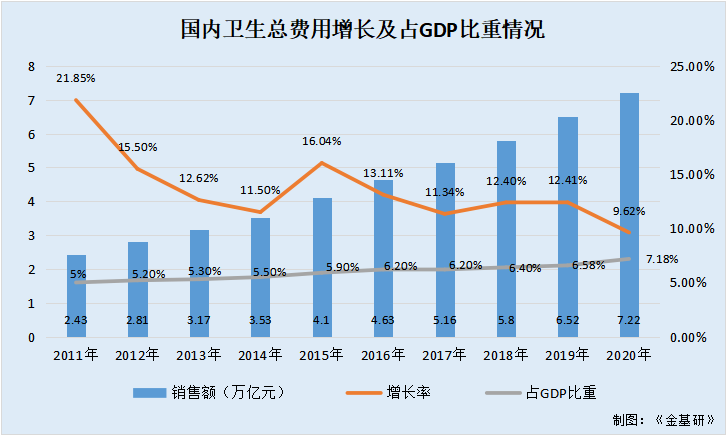 2011-2020年,国内卫生总费用已从2.43万亿元攀升至7.22万亿元(CAGR为10.5%,明显高于同期GDP增速)。同时,国内卫生总费用占GDP比重从2011年的5%提升至2020年的7.18%。预计未来国内医疗卫生支出在国民经济中的重要性仍将持续得到提升。