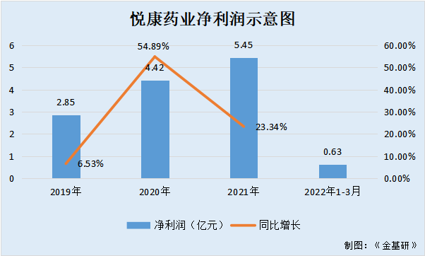 2019-2021年及2022年1-3月,悦康药业的净利润分别为2.85亿元、4.42亿元、5.45亿元、0.63亿元,2019-2021年分别同比增长6.53%、54.89%、23.34%。