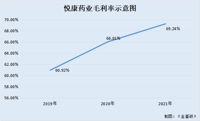 据东方财富Choice数据,2019-2021年及2022年1-3月,悦康药业的销售毛利率分别为60.92%、66.01%、69.24%、64.65%。
