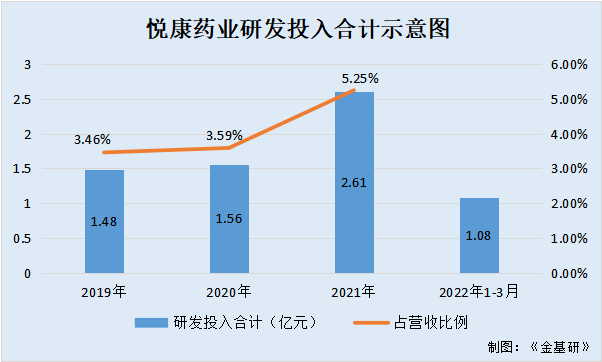 2019-2021年及2022年1-3月,悦康药业的研发投入合计分别为1.48亿元、1.56亿元、2.61亿元、1.08亿元,占当期营业收入的比例分别为3.46%、3.59%、5.25%、11.93%。