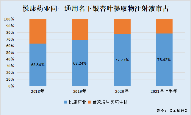 从悦康药业主要产品银杏叶提取物注射液来看,根据米内网城市公立和县级公立数据库统计,悦康药业同一通用名下银杏叶提取物注射液的市场占有率处于绝对优势地位,2018-2020年及2021年上半年,悦康药业银杏叶提取物注射液占比分别达63.54%、68.24%、77.73%、78.42%,均排名第一。
