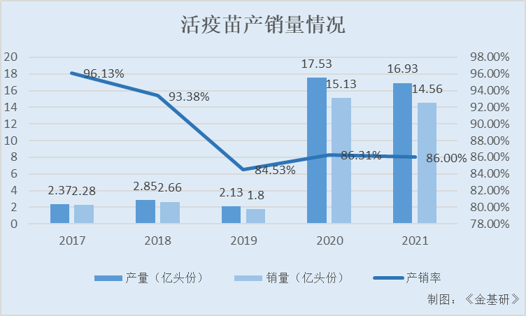 2017-2021年,科前生物活疫苗的产量分别为2.37亿头份、2.85亿头份、2.13亿头份、17.53亿头份、16.93亿头份,销量分别为2.28亿头份、2.66亿头份、1.8亿头份、15.13亿头份、14.56亿头份;同期,活疫苗的产销率分别为96.13%、93.38%、84.53%、86.31%、86%。