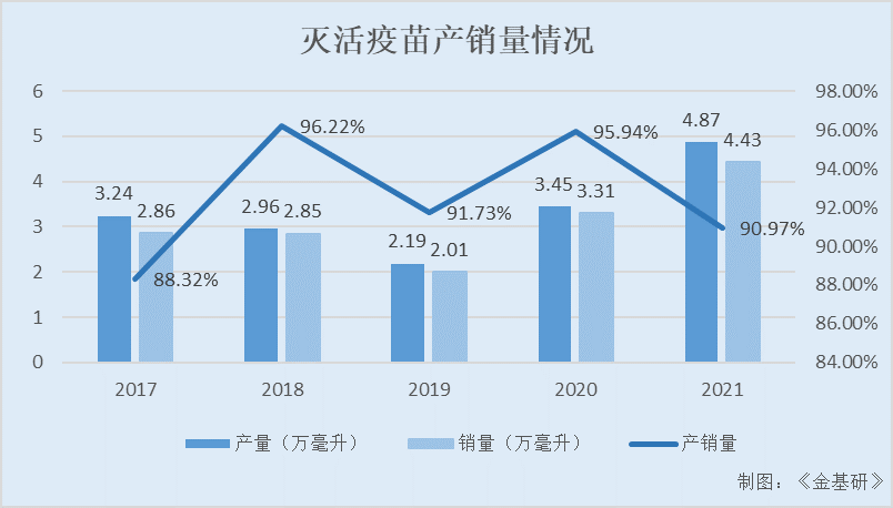 2017-2021年,科前生物灭活疫苗的产量分别为3.24万毫升、2.96万毫升、2.19万毫升、3.45万毫升、4.87万毫升,销量分别为2.86万毫升、2.85万毫升、2.01万毫升、3.31万毫升、4.43万毫升;同期,科前生物灭活疫苗的产销率分别为88.32%、96.22%、91.73%、95.94%、90.97%。