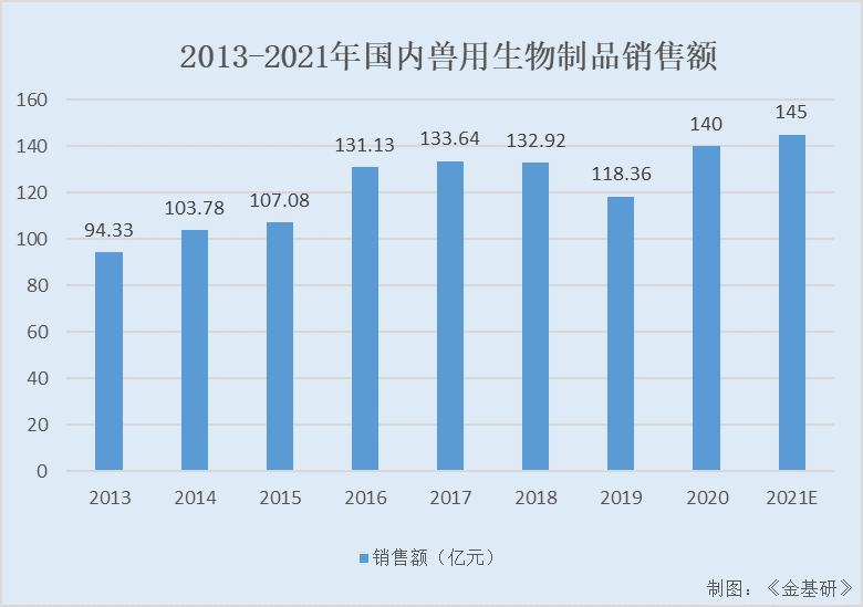2013-2021年国内兽用生物制品销售额分别为94.33亿元、103.78亿元、107.08亿元、131.13亿元、133.64亿元、132.92亿元、118.36亿元、140亿元、145亿元。