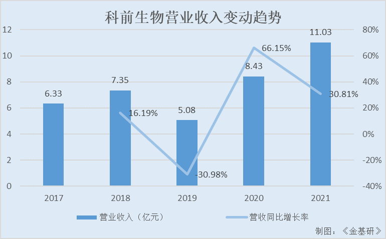 2017-2021年,科前生物的营业收入分别为6.33亿元、7.35亿元、5.08亿元、8.43亿元、11.03亿元,2018-2021年分别同比增长16.19%、-30.98%、66.15%、30.81%。2019年主要是受非洲猪瘟疫情影响,营业收入有所下降,2020-2021年营业收入呈现上涨趋势。