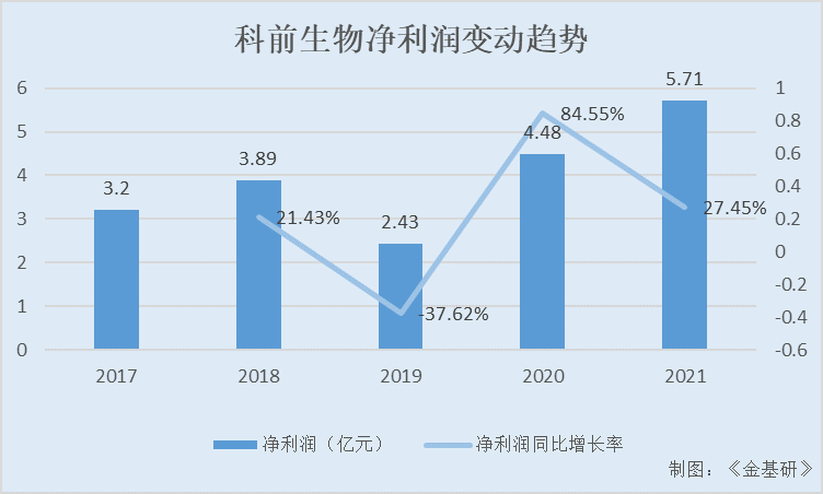 同期,科前生物实现的净利润分别为3.2亿元、3.89亿元、2.43亿元、4.48亿元、5.71亿元,2018-2021年分别同比增长21.43%、-37.62%、84.55%、27.45%。
