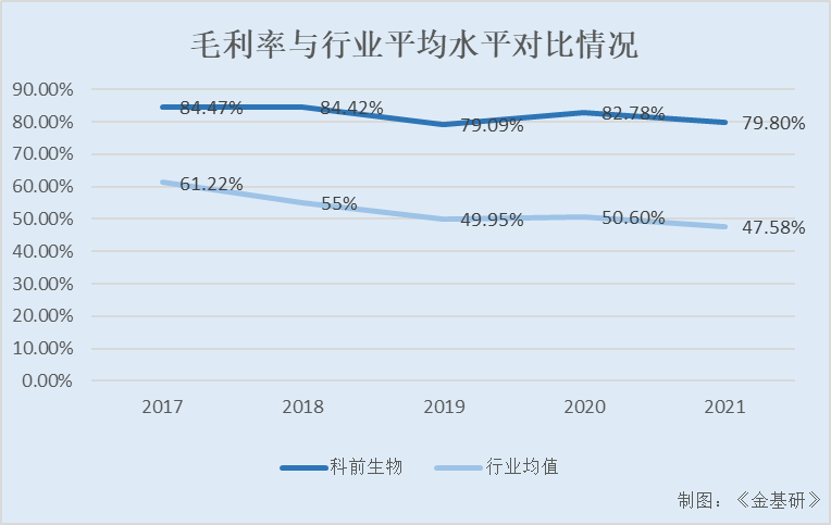 2017-2021年,科前生物的毛利率分别为84.47%、84.42%、79.09%、82.78%、79.8%。