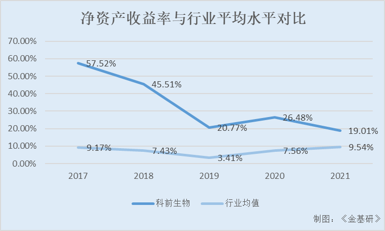 2017-2021年,科前生物净资产收益率分别是57.52%、45.51%、20.77%、26.48%、19.01%。