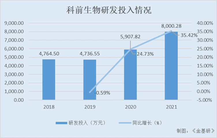 2018-2021年,科前生物的研发投入分别为4,764.5万元、4,736.55万元、5,907.82万元、8,000.28万元,2019-2021年分别同比增长-0.59%、24.73%、35.42%。