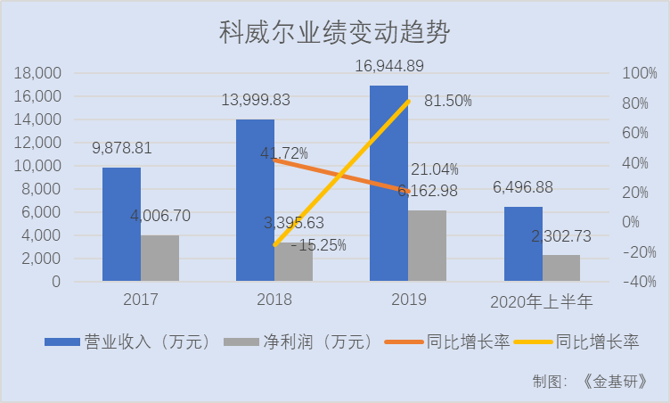 2017-2019年及2020年上半年,科威尔的营业收入分别为9,878.81万元、13,999.83万元、16,944.89万元、6,496.88万元,2018-2019年分别同比增长41.72%、21.39%。