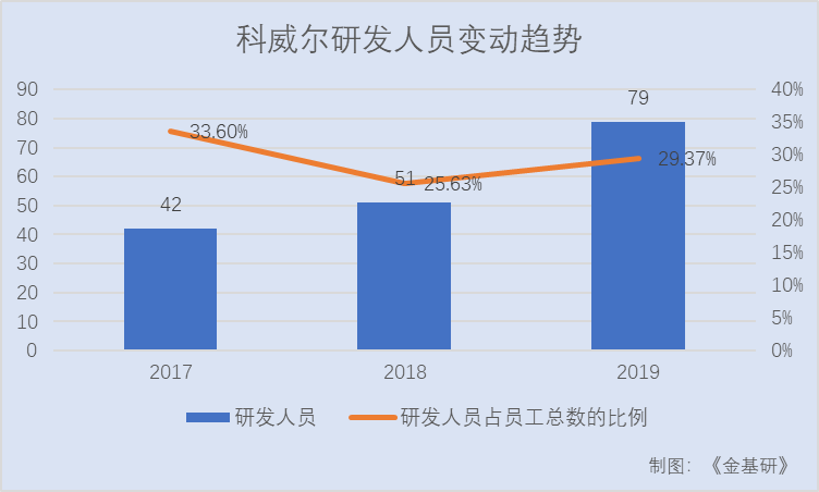 2017-2019年,科威尔的研发人员分别为42 人、51 人、79 人,占员工总人数