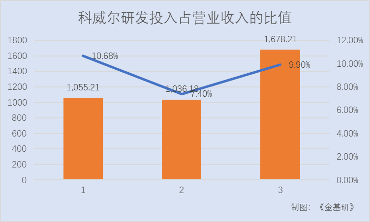 2017-2019年,科威尔的研发投入金额分别为1,055.21万元、1,036.18万元、1,678.21万元,占营业收入的比值分别为10.68%、7.4%、9.9%。