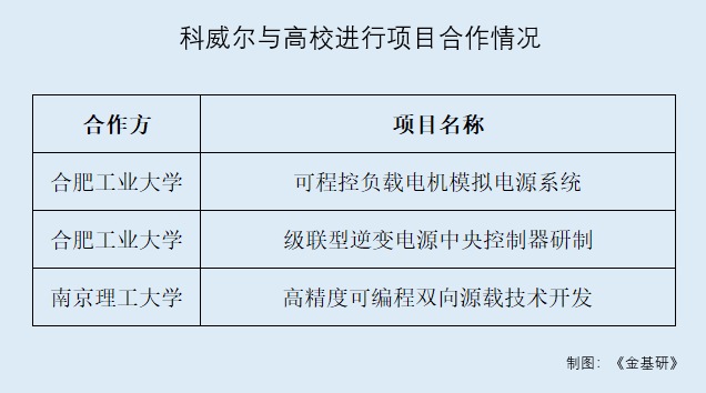 截止2020年8月20日,科威尔与合肥工业大学合作了可程控负载电机模拟电源系统项目、级联型逆变电源中央控制器研制项目、级联型逆变电源单元控制器研制项目、高精度可编程双向源载技术开发项目,与南京理工大学合作了高精度可编程双向源载技术开发项目。