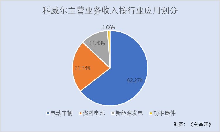 目前科威尔的产品应用于电动车辆、燃料电池、新能源发电、功率器件等行业的收入占主营业务收入的比值分别为62.27%、21.74%、11.43%、1.06%。