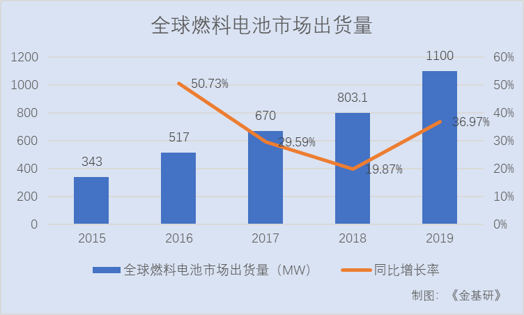近年来,燃料电池行业日益受到各国和政府的关注,全球燃料电池市场出货量增长快速。据前瞻研究院数据,2015-2019年,全球燃料电池市场出货量分别为343MW、517MW、670MW、803.1MW、11,00MW,2016-2019年分别同比增长50.73%、29.59%、19.87%、36.97%。