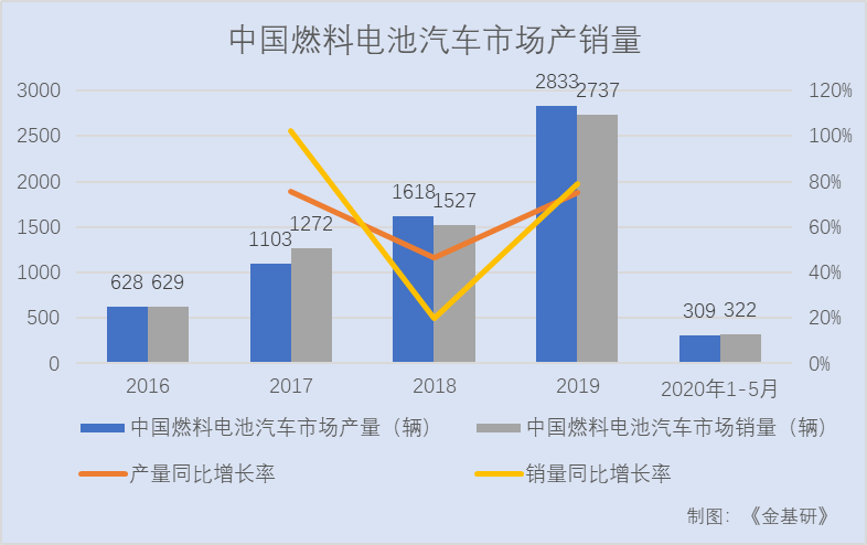 2016-2019年及2020年1-5月,中国燃料电池汽车市场产量分别为628辆、1,103辆、1,618辆、2,833辆、309辆,2017-2019年分别同比增长75.64%、46.69%、75.09%。