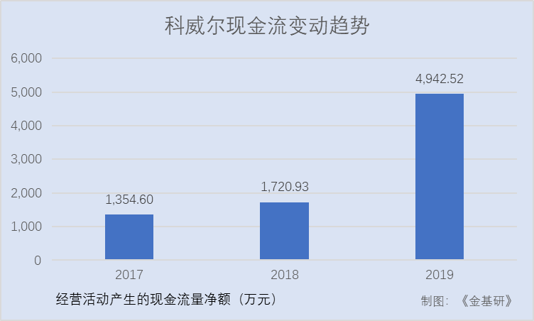 尽管2018年科威尔的净利润经历“短暂”下滑,但2019年科威尔的净利润实现了跨越性的增长。而营业收入的稳定增长,离不开的是充足的现金流,近三年来科威尔的现金流均保持充足。