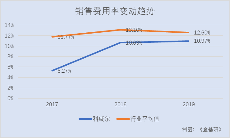 根据上述三家同行业上市公司的数据可知,2017-2019年,科威尔同行业上市公司销售费用率的平均值分别为11.77%、13.1%、12.6%。
