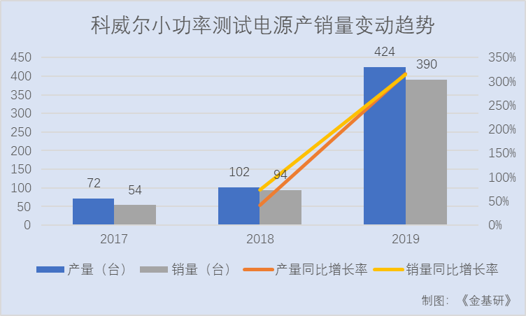 另一方面,科威尔小功率测试电源的产销量也逐年攀升。2017-2019年,科威尔小功率测试电源的产量分别为72台、102台、424台,2018-2019年分别同比增长41.67%、315.69%。