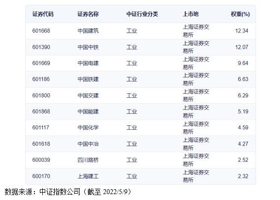 广发中证基建工程ETF跟踪中证基建工程指数,该指数从沪深市场中选取建筑与工程、建筑装修行业的龙头上市公司证券作为指数样本,前十大样本股包括中国建筑、中国中铁、中国电建、中国铁建、中国交建、中国能建、中国化学、中国中冶、四川路桥、中国建工等基建领域核心公司,指数样本的龙头集中效应突出,为市场提供一键式布局基建板块的指数工具。