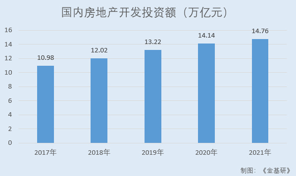 2017-2021 年,国内房地产开发投资规模分别为10.98万亿元、12.02万亿元、13.22万亿元、14.14万亿元、14.76万亿元。